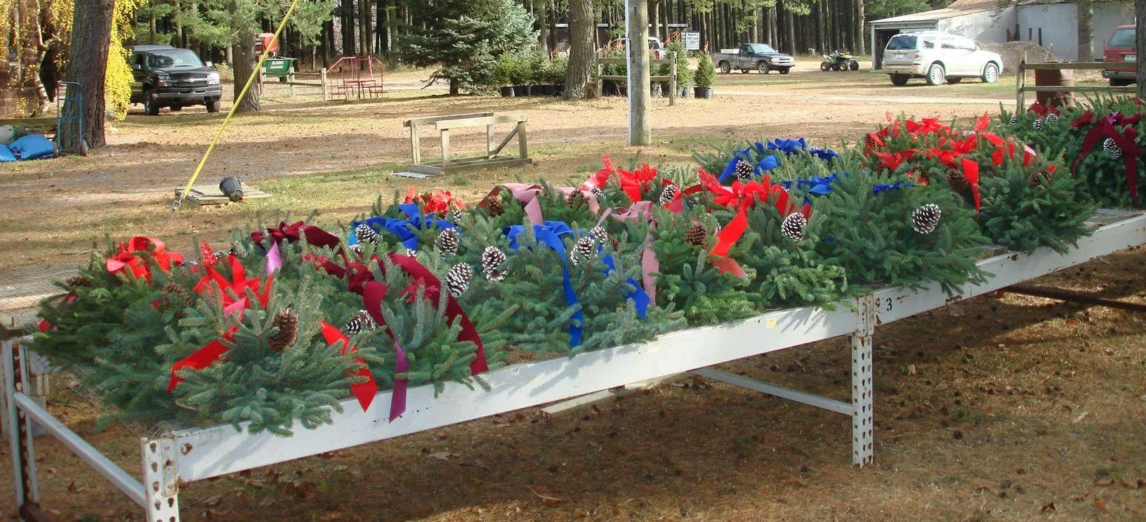 Fresh wreaths, which we make on site, daily, we custom decorate 10" and 14" wreaths. Shown above and below. Undecorated wreaths also available. We take special orders for large decorated wreaths 18" through 48"